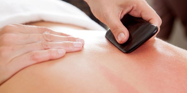 Massage oil is applied to the skin and a small gua sha tool is used to scrape along the skin. Gua sha can increase circulation, promote lymphatic circulation, remove toxins from the body, release tension in the muscles, and break down myofascial scar tissue.